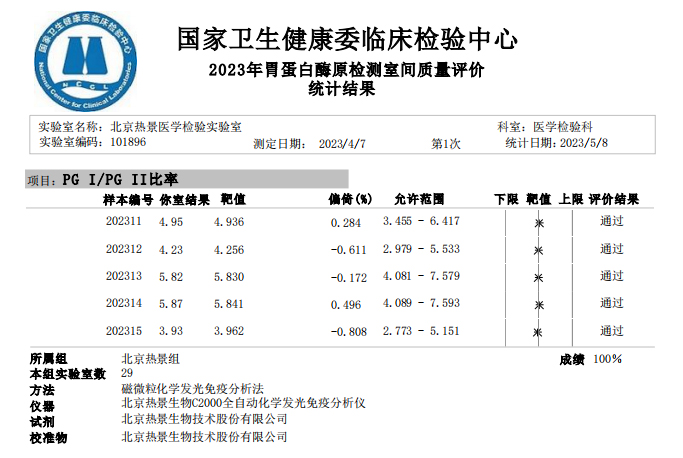 近日,國家衛(wèi)生健康委臨床檢驗(yàn)中心(NCCL)公布了2023年多項(xiàng)全國臨床檢驗(yàn)室間質(zhì)量評(píng)價(jià)結(jié)果。熱景生物旗下熱景醫(yī)學(xué)檢驗(yàn)實(shí)驗(yàn)室以100分的優(yōu)異成績通過“胃蛋白酶原”“血清降鈣素原”“N末端前腦鈉肽”“心肌標(biāo)志物”等室間質(zhì)評(píng)項(xiàng)目。同時(shí),熱景生物參與的上海市臨床檢驗(yàn)中心2023年第一次能力驗(yàn)證項(xiàng)目,包括B型鈉尿肽/N端-B型鈉尿肽前體、AFP異質(zhì)體比率、肌鈣蛋白I、降鈣素原等項(xiàng)目均通過驗(yàn)證,充分彰顯了熱景生物穩(wěn)定可靠的實(shí)驗(yàn)室質(zhì)量管理和檢測(cè)能力,以及強(qiáng)大的產(chǎn)品和技術(shù)實(shí)力!