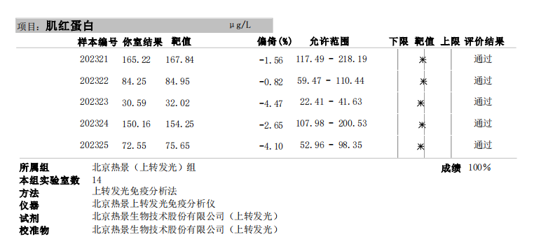 近日,國家衛(wèi)生健康委臨床檢驗(yàn)中心(NCCL)公布了2023年第二次全國臨床檢驗(yàn)室間質(zhì)量評價(jià)結(jié)果。經(jīng)了解,熱景生物心肌標(biāo)志物(肌酸激酶同工酶、肌紅蛋白、肌鈣蛋白I)、血清降鈣素原項(xiàng)目的上轉(zhuǎn)發(fā)光及化學(xué)發(fā)光兩大平臺(tái)產(chǎn)品,以及D-二聚體、白介素6、胃蛋白酶原項(xiàng)目的化學(xué)發(fā)光平臺(tái)產(chǎn)品均滿分通過此次室間質(zhì)量評價(jià)。同時(shí),熱景生物參與的上海臨床檢驗(yàn)中心2023年第二次能力驗(yàn)證活動(dòng),包括AFP異質(zhì)體比率、B型鈉尿肽/N末端B型鈉尿肽前體、心肌標(biāo)志物(肌酸激酶同工酶、肌紅蛋白、肌鈣蛋白I)、血清降鈣素原等項(xiàng)目在內(nèi)的產(chǎn)品均通過評價(jià)。