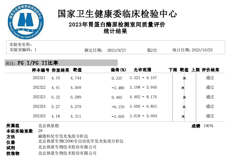 胃蛋白酶原(PGI、PGII、PGI/PGII比率)室間質(zhì)評成績單