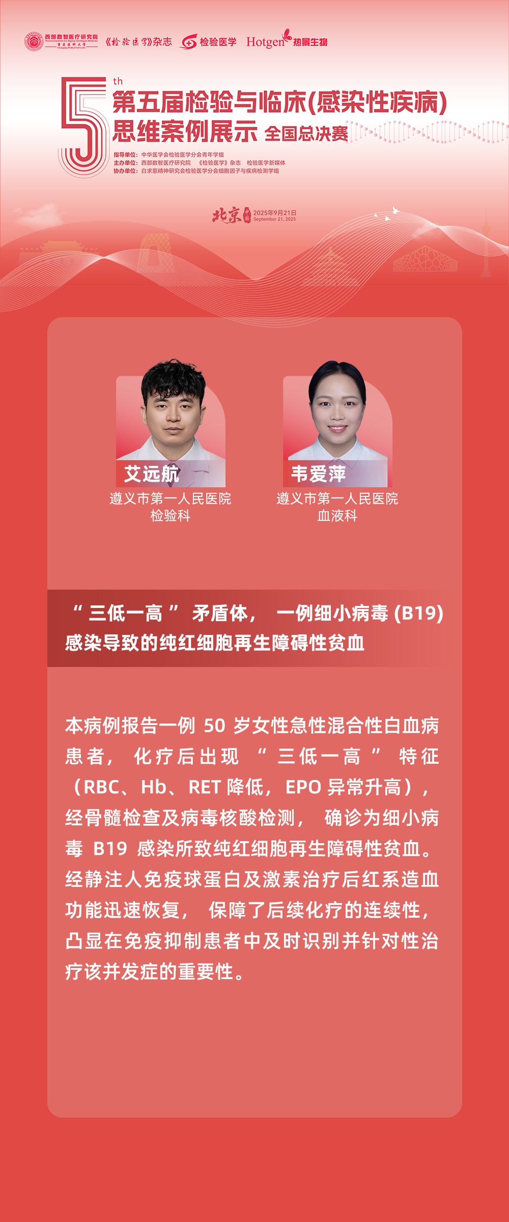為了更有效地推進檢驗與臨床之間的溝通,促進跨學科交流與合作,實現(xiàn)檢驗與臨床的融合發(fā)展,在大會召開期間,舉辦了檢驗與臨床思維案例展示活動暨“2025年全國檢驗與臨床思維案例展示總決賽”。其中,由熱景生物支持的“第五屆檢驗與臨床(感染性疾病)思維案例展示全國總決賽”冠軍組案例,即來自遵義市第一人民醫(yī)院的《“三低一高”矛盾體,一例細小病毒(B19)感染導致的純紅細胞再生障礙性貧血》、重慶大學附屬三峽醫(yī)院的《NGS導航下的“糞”怒突圍——一例溺糞患兒感染的密碼破譯戰(zhàn)》案例入選“2025年全國檢驗與臨床思維案例展示總決賽”。