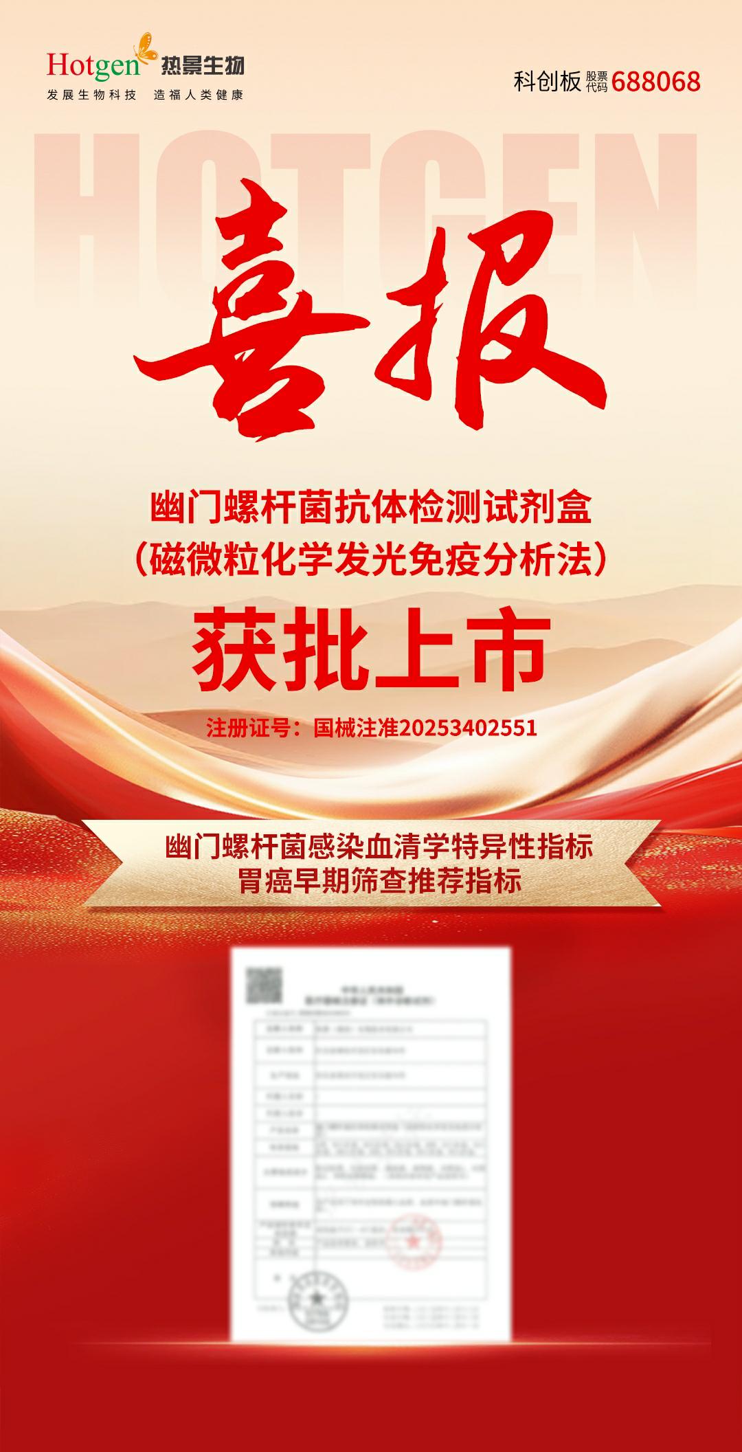 近期,北京熱景生物憑借深厚的研發(fā)積淀與技術(shù)創(chuàng)新實(shí)力,成功斬獲一項(xiàng)新的醫(yī)療器械注冊證——幽門螺桿菌抗體檢測試劑盒(磁微粒化學(xué)發(fā)光免疫分析法)正式通過國家藥品監(jiān)督管理局批準(zhǔn)!這是繼胃蛋白酶原Ⅰ(PGⅠ)、胃蛋白酶原Ⅱ(PG Ⅱ)和胃泌素17(G17)后的第四個(gè)胃功能檢測項(xiàng)目,豐富了熱景生物在胃病管理領(lǐng)域的產(chǎn)品矩陣,為臨床診療提供更精準(zhǔn)的解決方案,為胃癌早期篩查提供更全的有效依據(jù)。