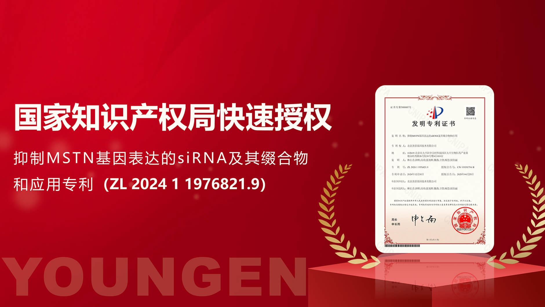 近日,熱景生物參股公司北京堯景基因技術有限公司,被國家知識產(chǎn)權局快速授權了名為“抑制MSTN基因表達的siRNA及其綴合物和應用”專利(ZL202411976821.9)。該專利提供一種能夠抑制MST...